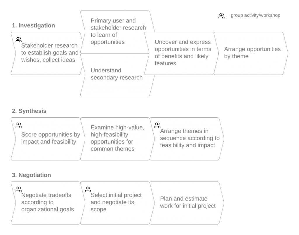 You've produced the raw material necessary for the stakeholders to help arrange opportunities into a rough sequence. Depending on scope the entire synthesis phase could be done in one workshop, or it might require two with some thinking and preparation in between.